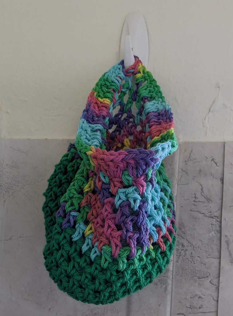 What do you do when you’ve used a washcloth, especially one you’ve made yourself, and it needs to be washed, but you haven’t quite finished your shower yet? I had been putting it back to hang dry, but then I would forget to move it to the wash and it would still be there for my next shower. So, I made a shaped mesh bag to hang from a command hook in the back of my shower! Now, I’ve also made one to hang just outside my shower so I can grab a clean washcloth once I’ve turned on the water and realized that I need one!