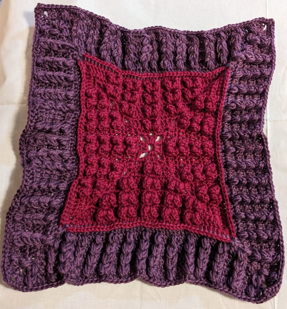 - Standing DC and puff stitch, (DC in next 3 stitches, [FPPuff stitch, DC3] across, [Puff, DC, Ch2, DC, Puff] all in the same corner space) 3x, (DC in next 3 stitches, [FPPuff stitch, DC3] across, Puff and DC in corner space, and HDC corner to close